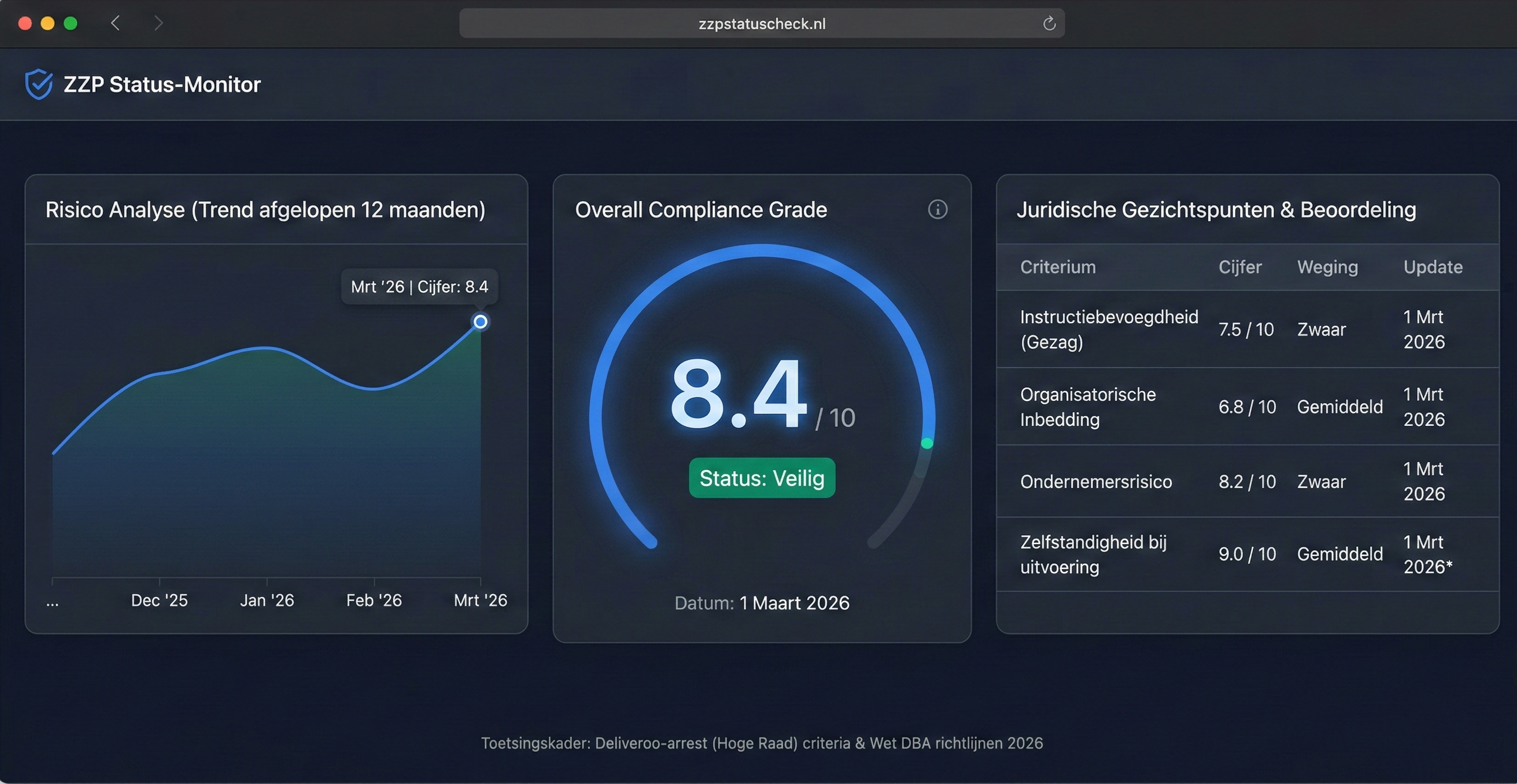 De ZZP Status-Monitor is een geautomatiseerde analysetool gebaseerd op het Deliveroo-arrest en de Wet DBA. Dit rapport dient als feitelijke onderbouwing van uw arbeidsrelatie